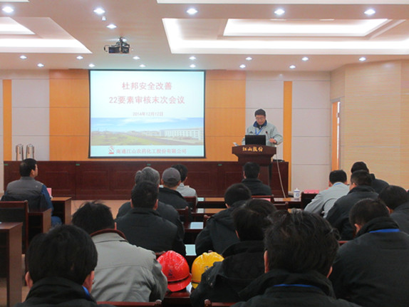 12月12日下午,杜邦安全改善项目年度审核末次会议在江山股份西区6号会议室召开。该公司总经理薛健发表重要讲话。 12月8日至11日,杜邦审核老师对我公司杜邦安全改善项目进行阶段性审核。本次审核依据的是杜邦安全管理系统的行为安全(安全文化机制)和工艺安全(风险管理机制)22要素审核清单。审核老师主要通过访谈、查阅、观察三种方法了解公司当前的HSE管理现状,并进行审核评分。