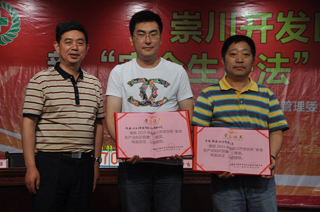 由崇川开发区安全生产委员会组织的新“安全生产知识竞赛”于6月11日下午在金通灵公司举行,南通纺织控股集团纺织染有限公司由陈杰明带队,陈云莉、王建兴、吉王倩三人组成的代表队参加了此次比赛。经过紧张激烈的角逐,最终,纺织染代表队荣获比赛二等奖,南通崇川区安全监督局副主任毛长平为我公司获奖队员颁发了荣誉证书。