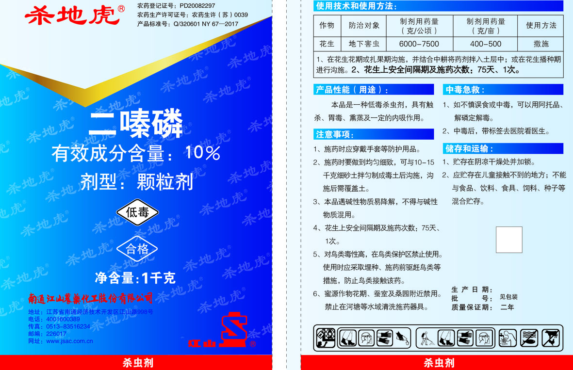 南通江山农药化工股份有限公司是二嗪磷颗粒剂和二嗪磷乳油在国内获得登记较早的企业,其中“杀地虎”(10%二嗪磷颗粒剂)是面市较早、市场份额较大的二嗪磷颗粒剂产品,堪称“引导者”。二嗪磷市场前景看好。可替换被禁限用有机磷类防治地下害虫市场,如克百威(呋喃丹)、毒死蜱等。也能替换被禁限用有机磷类拌种药剂市场,如甲拌磷、甲基异柳磷等。另外可作为酰胺类杀虫剂的有效补充,因为水稻田酰胺类杀虫剂抗性突起,且对二化螟、三化螟效果不佳。农药使用要按照规定的用药量、用药次数、用药方法和用药间隔期施药,低毒的二嗪磷是可以放心在蔬菜上使用的。