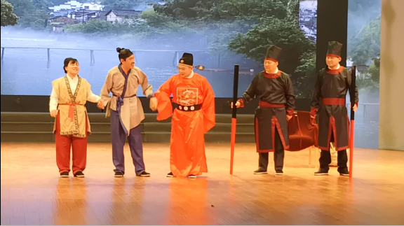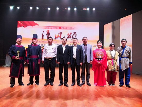 南通产业技术研究院有限公司选送的小品《审舅舅》以古代县官面对情与法的冲突如何进行抉择为背景展开故事,以轻松诙谐的表演讲述法不容情的道理,寓意深刻,让现场观众在欢声笑语中领会为官一任必须忠诚、干净、担当,获得阵阵喝彩。