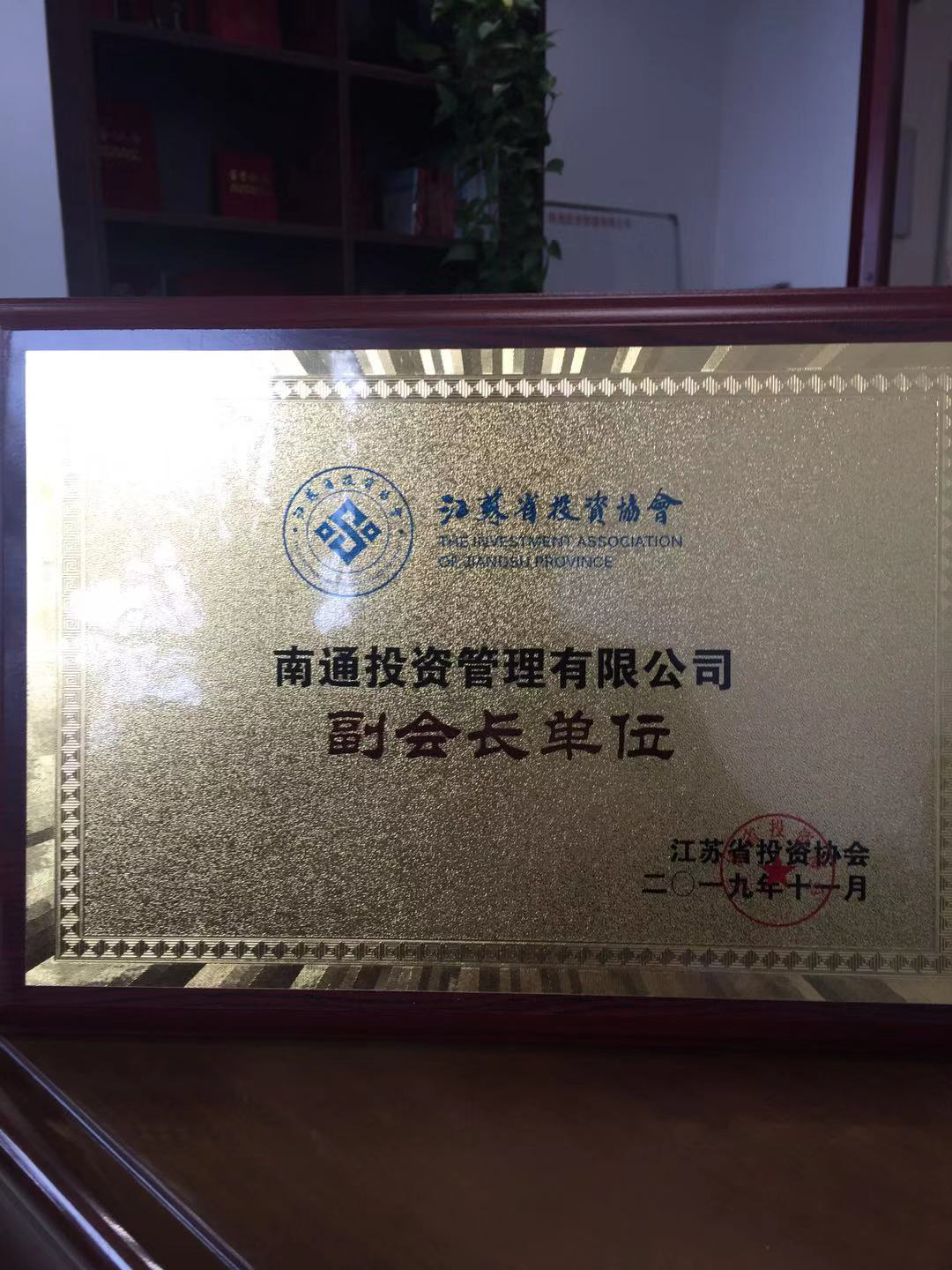 日前,江苏省投资协会第四届三次会员代表大会审核批准南通投资管理有限公司为第四届江苏省投资协会副会长单位,并颁发了南通投资管理有限公司副会长单位牌和江苏省投资协会会员证书。