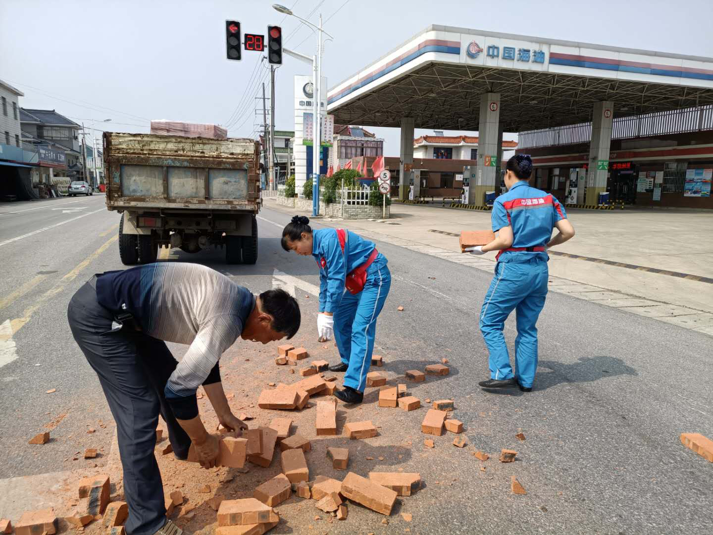 夏天的中午,天气炎热,似乎连树上的知了也停止了歌唱。华东销售南通公司栟茶加油站站前道路,似乎和往常一样,车辆人流来来往往,当班的缪小红和蔡翠和顶着炎热在加油岛上等待下一个顾客来加油。突然,“吱呀~~~”一个急刹,一辆避让行人的运砖车差点翻车,晃悠了几次总算停稳了,但是车上的砖块纷纷滚落。后方行驶的车辆有些来不及避让,差点酿成新的事故,散落的砖块对道路交通安全构成隐患。司机惊魂未定,赶忙下车查看,立刻开始将散落在道路上的砖往车上搬。
