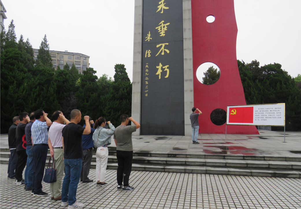 烈士陵园内,庄严肃静。由朱德伟人亲笔题词的“革命烈士永垂不朽”纪念塔屹立在陵园广场,在纪念塔下,由党支部副书记凌德均领读,全体党员高举右手,再次庄严宣誓,重温入党誓词。