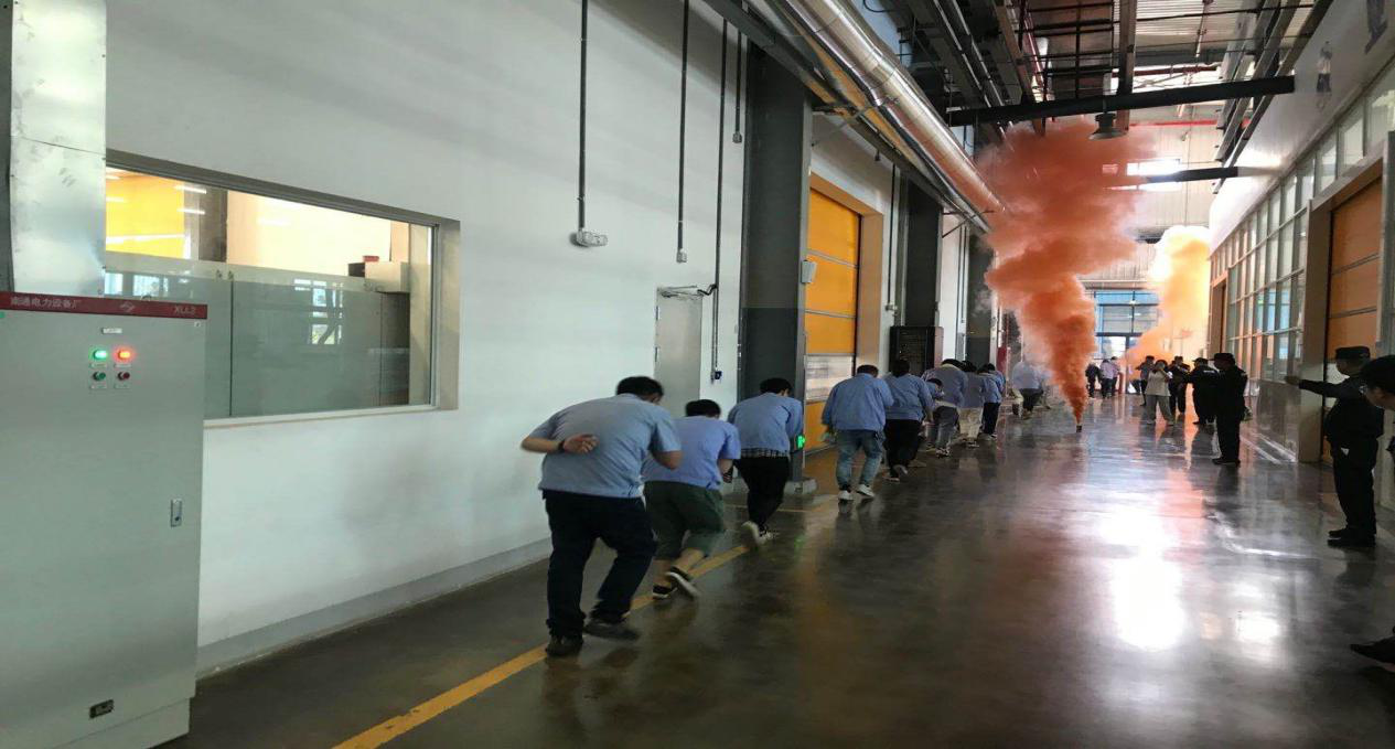 通能精机作为园区资产管理部门,在企业管理过程中,严格落实园区企业安全管理职责,认真开展园区安全管理活动,不断检查、完善和提高园区各单位的安全管理水平和防灾救灾的应急管理能力。对于本次活动,通能精机管理层高度重视,总经理张秀兵亲自挂帅,要求公司安全具体负责人员和外聘专家一起,为本次活动制定周密计划和活动方案,认真落实各项应急物资准备和人员组织工作,组织开展好这次消防救灾与逃生应急演练。 通过演练时间的确定、火灾危险性分析、演习步骤实施、小组人员分工,参演人员的培训,有计划分步骤的实施,每项工作认真研究,仔细分析,集体讨论,共同谋划,为顺利完成演练工作打下扎实的基础。当演练总指挥发出演练开始的口令后,整个演练从发现火情,切断电源,自救互救、火灾蔓延扩大,启动火灾一级响应,义务消防队员迅速赶赴现场,组织火灾扑救,火灾报警和人员紧急疏散到火灾扑灭、人员集中清点人数到活动结束,整个活动按步骤有条不紊地进行。演练活动过程中,当安全员接到员工火警报告后,向总经理报告的急促声音和紧张的神情,义务消防队员迅速集结赶赴现场的动作,灭火器喷射的药液溅起火盆中浓浓的烟浪,员工猫着腰用湿布捂着鼻子在烟雾里向着安全区域逃生的样子,每个场景是那样的逼真,好像专业演员的出色表演,又好像经历了一场人与火的真正较量。