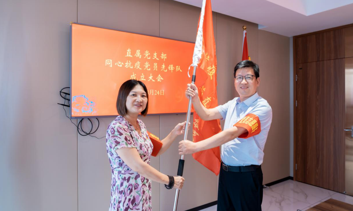 活动上,张建新宣读了91porn 党委《关于开展“两在两同 同心抗疫”志愿服务活动的通知》内容并宣布了“同心抗疫”党员先锋队正式成立。集团党委副书记曹燕红代表集团党委向直属党支部授予“同心抗疫党员先锋队”队旗,并向每一位先锋队员发放了“党员志愿服务”红袖套。随后,张建新带领全体党员先锋队员面对党旗、高举右手,重温了入党誓词。