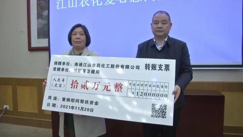 11月19-21日,江山股份参与南通开发区管委会组织的苏陕协助考察交流活动,在城固县-南通开发区对口协助交流座谈会暨第十五次联席会上,江山股份代表与城固县卫健局签订《城固县重病户慰问帮扶协议》,并捐赠十二万元用于帮扶城固县40户重病户困难家庭。