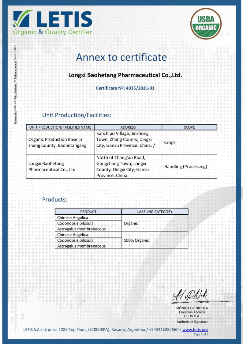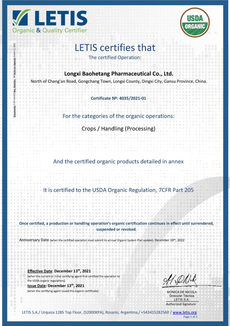 自2017年开始,陇西保和堂在推动道地有机种植基地建设、有机产品加工等方面不断发力,先后于2019年12月获得陇西、岷县、漳县、渭源、宕昌5个种植基地的《有机转换认证证书》,2020年12月获得当归、党参、黄芪的《有机产品认证证书》,2021年7月获得当归、党参、黄芪生产加工《有机产品认证证书》,并成功申请了产品有机标签。 公司从种子种苗繁育、土壤改良、种植基地建设、田间管理标准化、采挖加工等一系列环节入手,层层把关,厉行标准化有机种植基地建设和车间加工建设,实现了产品“来源可知,去向可追,过程可控,责任可究”,真正走出了一条产业优、质量高、可持续的发展新路子。此次美国NOP认证证书的取得,为公司进一步走向国际市场打下了坚定的基础。我们坚信随着公司产品品质和知名度的不断提升,“陇西保和堂”品牌产品会受到越来越多客户的推崇和信赖。