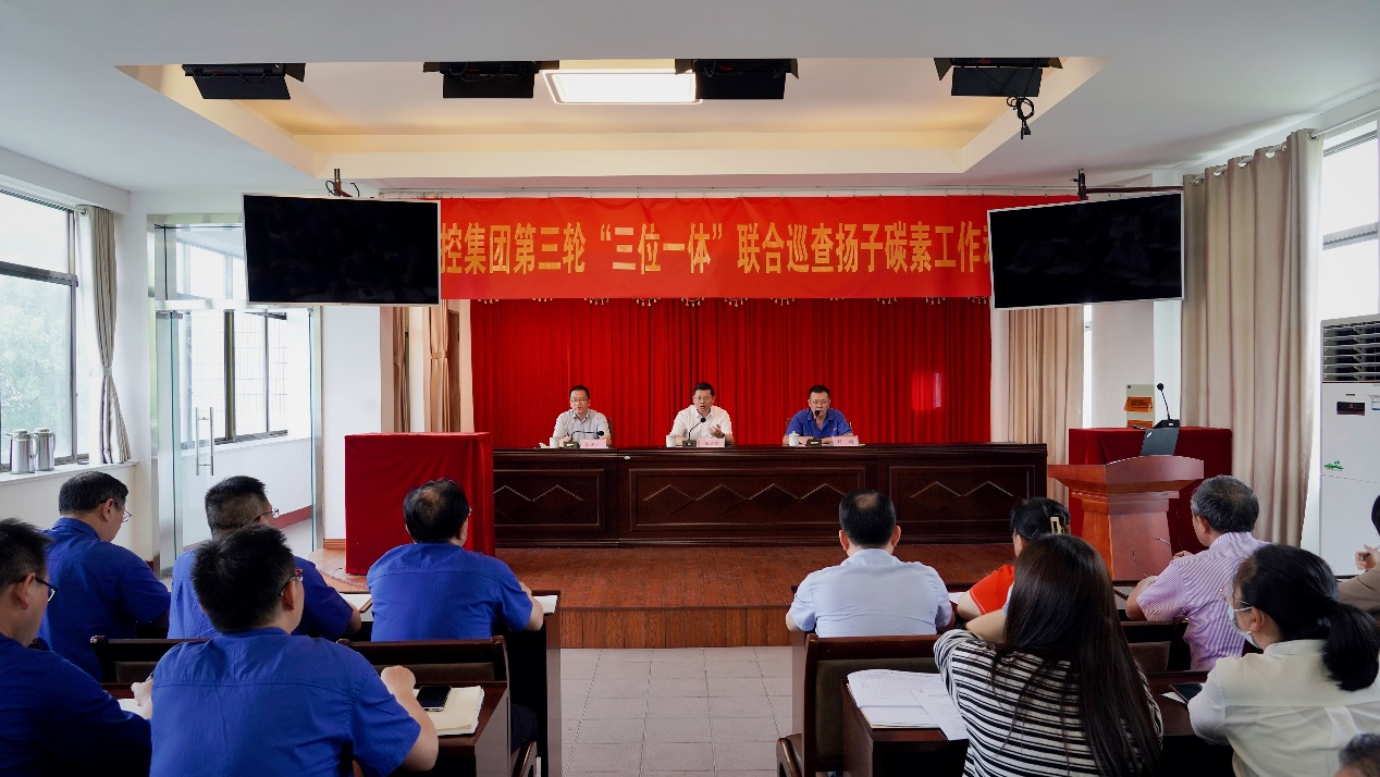 集团第三轮“三位一体”第四批次联合巡查工作全体成员、扬子碳素领导班子成员、全体中层干部参加会议,扬子碳素控股子公司旭峰炭素相关人员以视频分会场的形式参加了会议。