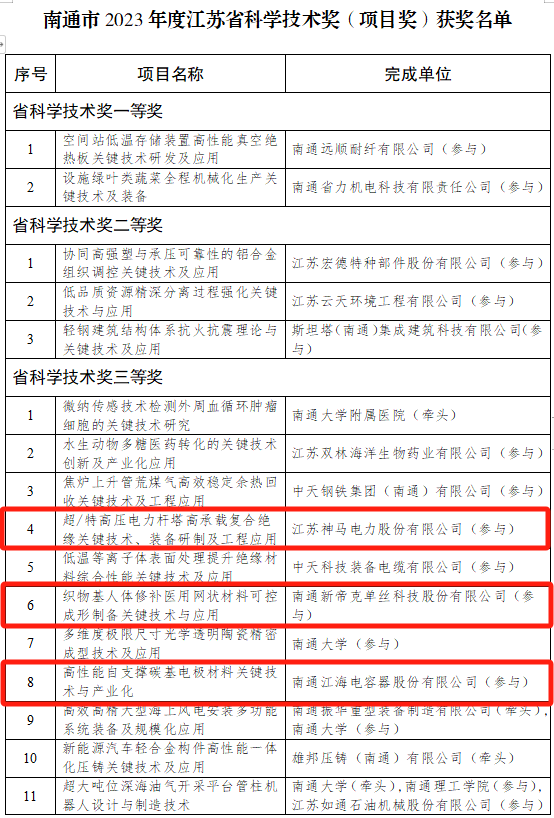 近日,江苏省人民政府公布《省政府关于2023年度江苏省科学技术奖励的决定》南通市共有18个项目荣获2023年度江苏省科学技术奖南通市产业投资母基金已投企业上榜4家。 其中,通富微电子股份有限公司荣获江苏省企业技术创新奖江苏神马电力股份有限公司、南通新帝克单丝科技股份有限公司、南通江海电容器股份有限公司各自参与的项目荣获江苏省科学技术奖(项目奖)三等奖。